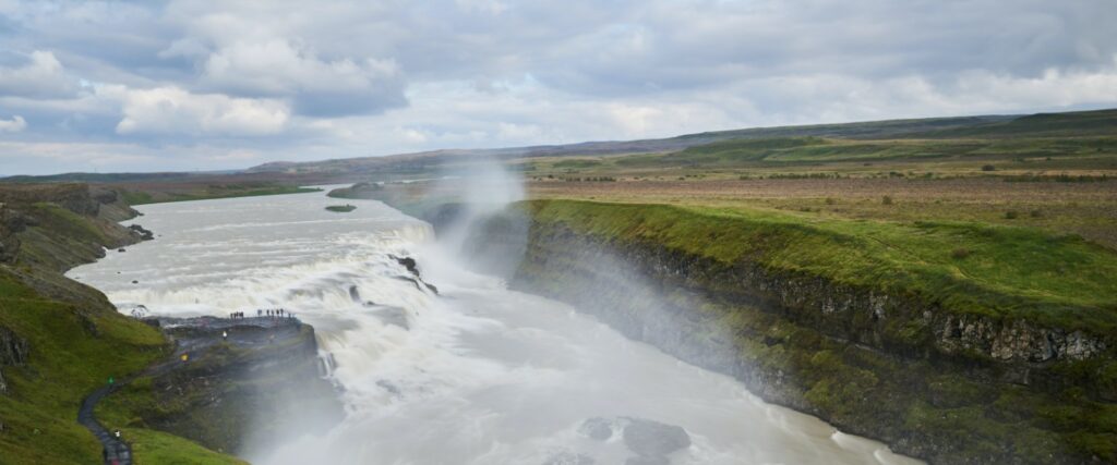 From fire, we move to the thundering Gullfoss waterfalls. This waterfall consists of two cascades that cut through a valley into a deep gorge, creating mists and rainbows you’ll definitely want to capture with your camera.